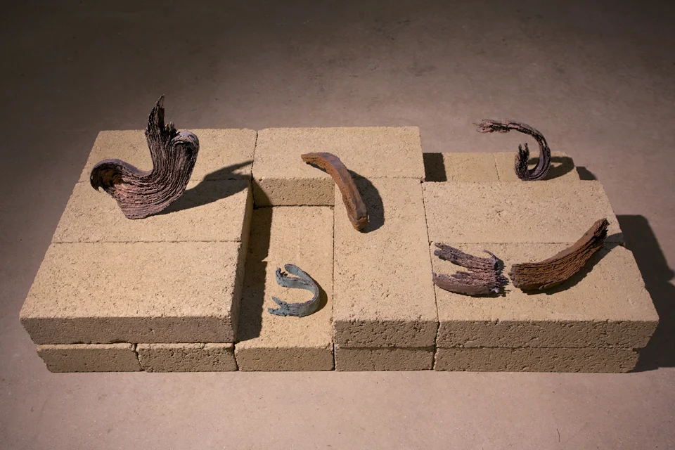 A sequence of glyph-like forms reverberates throughout Alida Sayer’s second solo exhibition at Marsden Woo Gallery. Extracts from the vocabulary of an unknown language, perhaps, or moments of human thought and activity crystallized into material fragments?