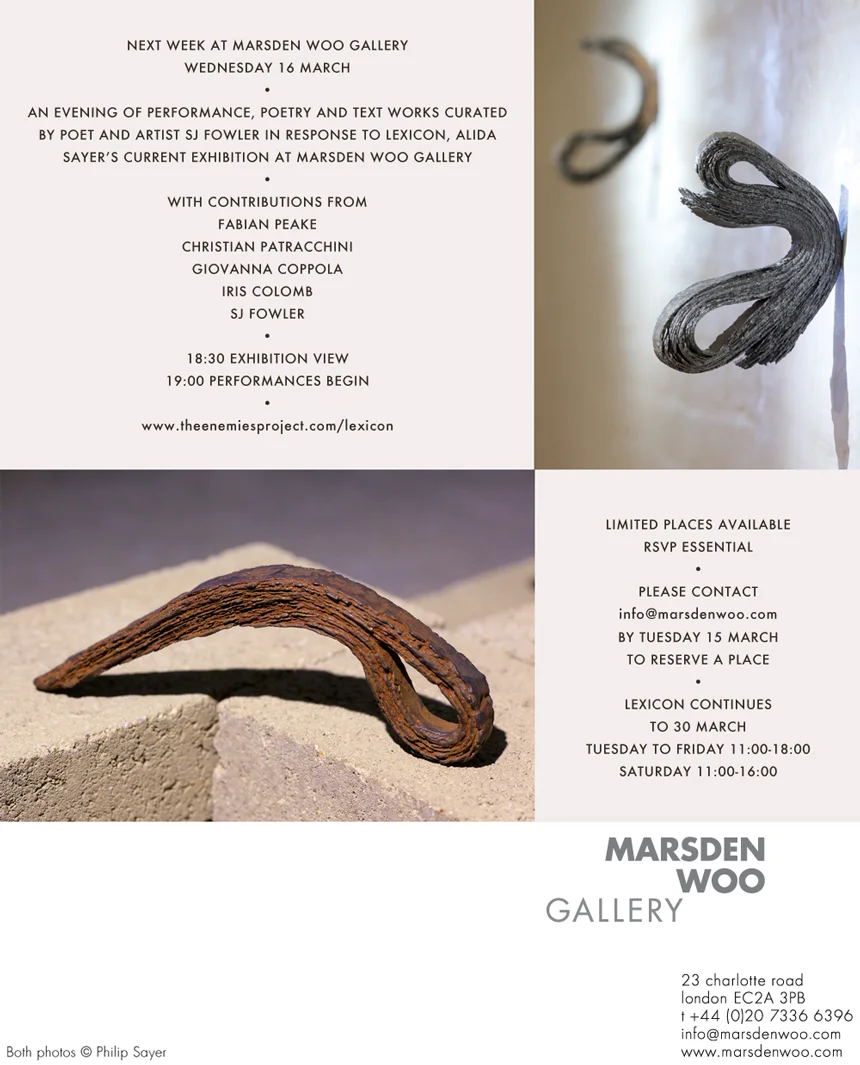 A note on curating the night by SJ Fowler Such a beautiful experience, to curate a night of new poetry and performance responding to Alida Sayer's magnificent exhibition at Marsden Woo Gallery. We did it all on quite a tight timeframe, really through my friendship with Marsden Woo curator Siobhan Feeney and an immediate passion I felt for Alida's work. She is interrogating, in sculpture, what I am interested in digging into in poetry - language, its instability, its material qualities, its graphic glypic abstraction. So I asked Giovanna Coppola, Fabian Peake, Iris Colomb and Christian Patracchini to come and see the work and we all presented this on a really enthusiastic evening, on March 16th (2016), in the gallery.